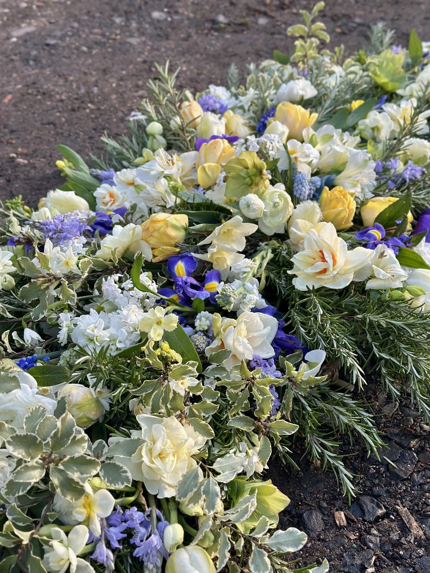 This is normally the main funeral arrangement, which runs along the top of the coffin and tapers at each end. It can be made to different lengths; a six-foot spray will cover the whole length of the coffin or you can have something shorter.