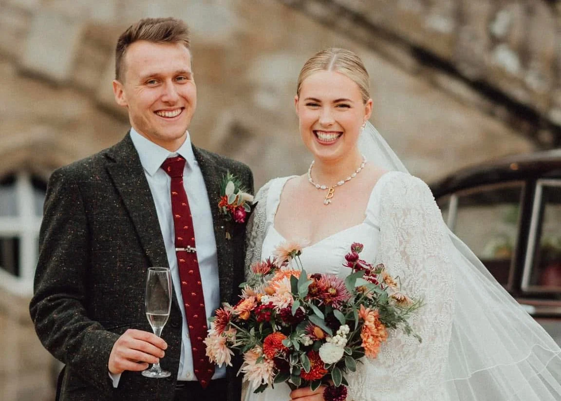 Alicia and Barney were married in late Autumn in Burbage and chose flowers in rich, seasonal tones of rust, peach and deep plum. Their arrangements included Chrysanthemums, Dahlias and seasonal foliage…